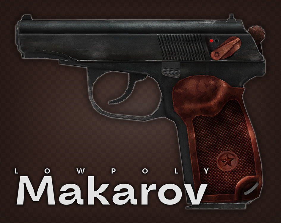 A low-poly Makarov 9x18 pistol modeled in Blender. The model was optimized with a proper chamber and moveable slider for animation.